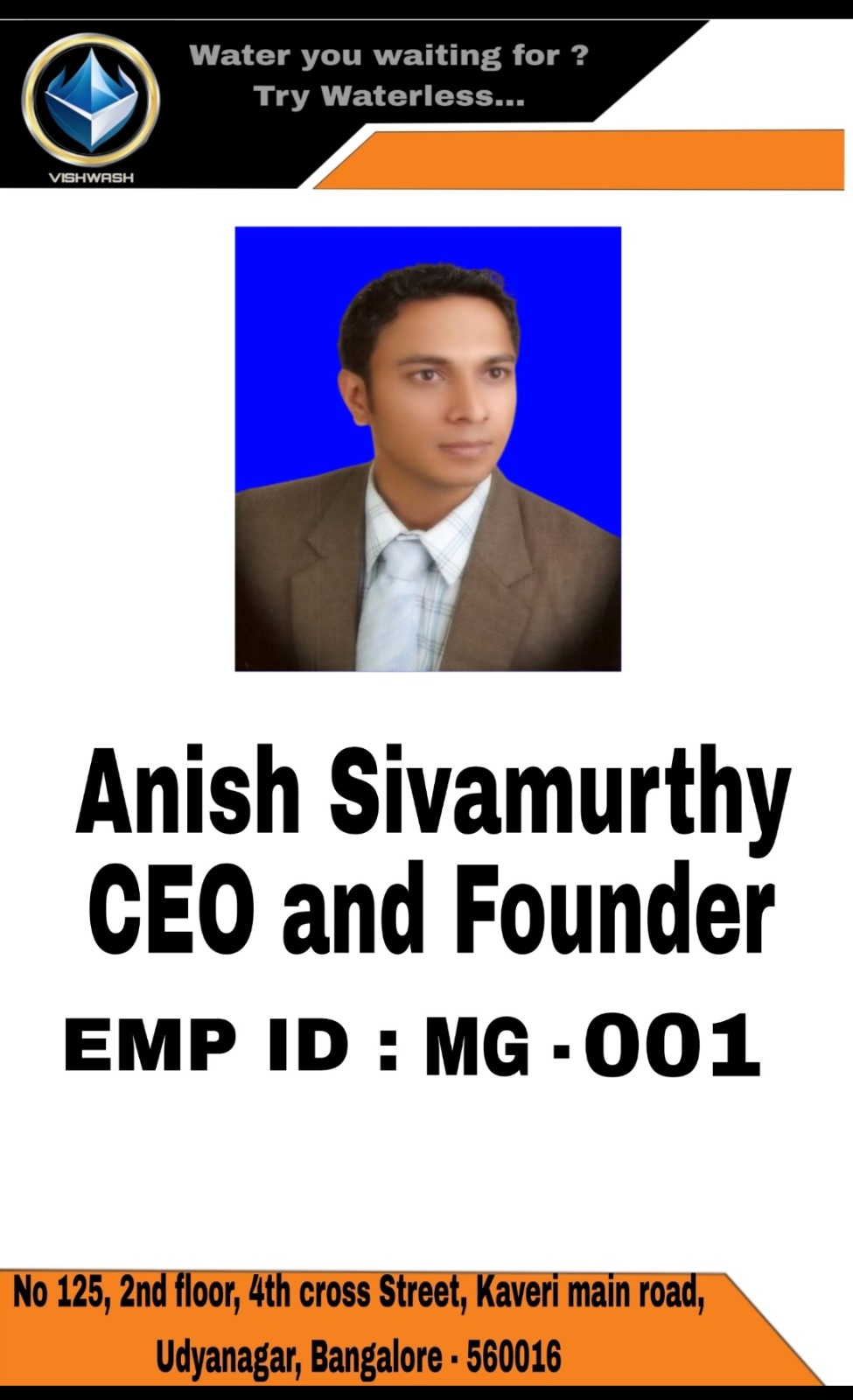 My name is Anish Sivamurthy; Founder & CEO of Vishwash, an eco-friendly waterless car wash company. We specialize in providing sustainable vehicle cleaning solutions that do not require the use of water. Instead, we use specially formulated cleaning solutions that lift dirt and grime, which are then gently wiped off using microfiber towels.